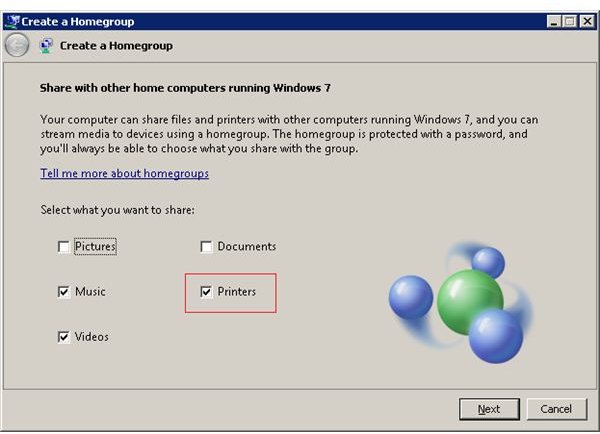 Go to Start > Control Panel , click "Network and Internet" and then click "Home Group" then click "Create a homegroup". (You can read more about the Homegroup here) A dialog new dialog window will come up and will ask you what are you planing to share in this Homegroup. Select the items you want to share (for our scenario don't forget to add the printers) and click Next. Windows will configure everything for you and a new page will come where you will be presented with a random generated password to be used by the other machines in your environment when they want to access the resources shared on this machine. Write down this password and click "Finish".