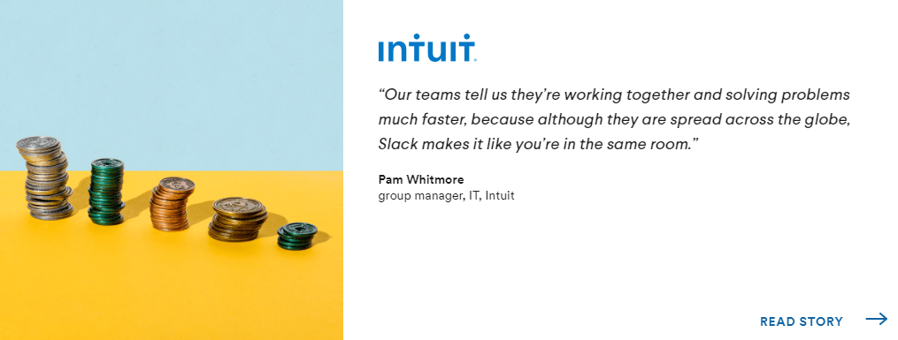 An IT Manager of Intuit (tax software) explains how Slack helps his teams to solve problems faster and feel more connected despite the physical distance between the staff. This will appeal to any IT manager in charge of remote teams whose pain point is inefficient teamwork through physical separation. This testimonial also offers a link at the bottom to read the full story, so people can read the complete case study.